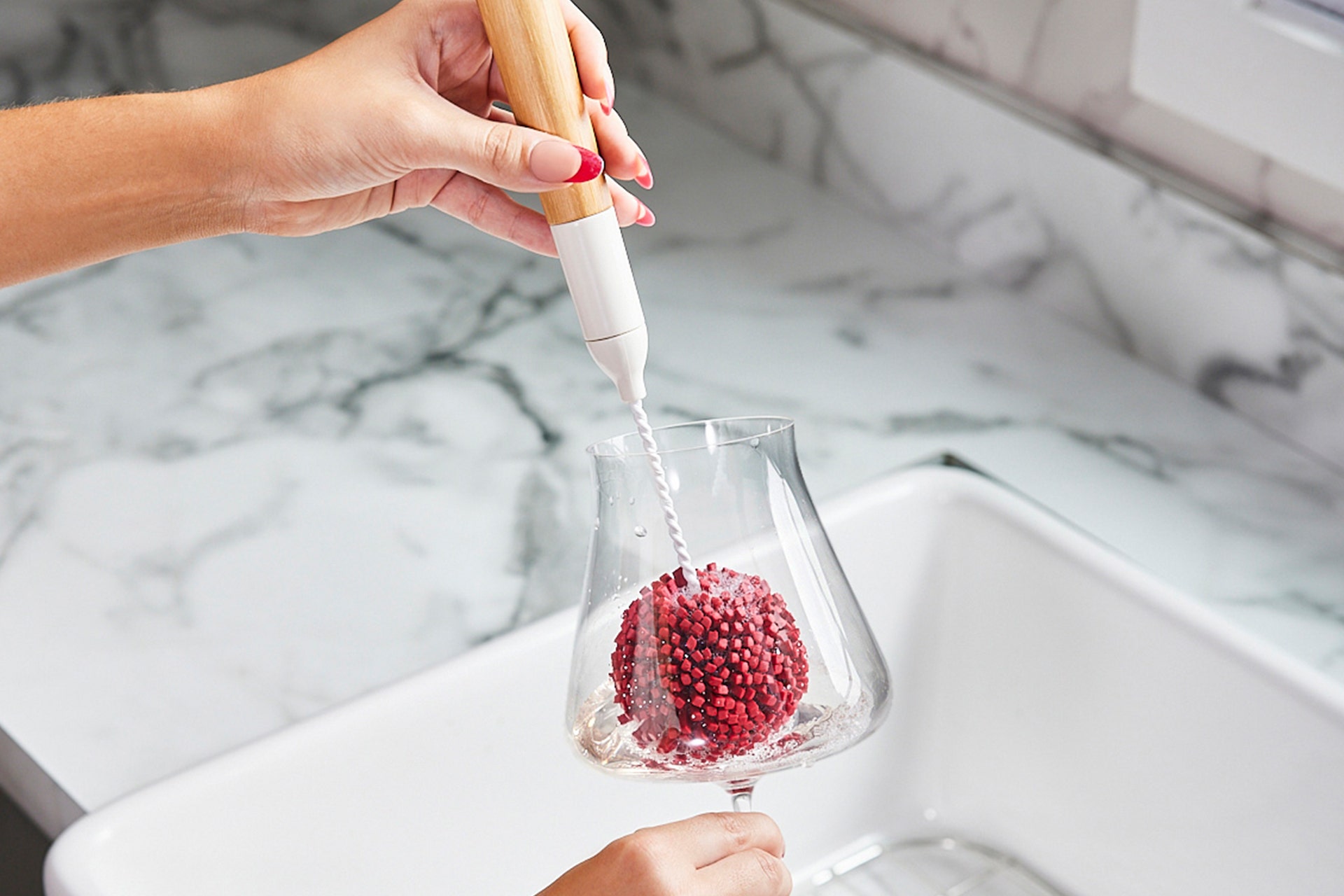 Ditch the sponge for a cleaning brush specifically made to clean stemware safely. Jackson uses a cleaning brush and recommends “doing a circular motion from the base all the way up.”