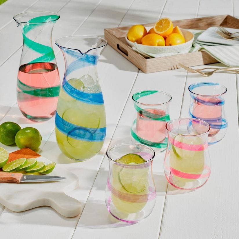 Hand-Painted Color Swirl Glass Carafe Duo and Double-Wall Tumblers (Set of 6)