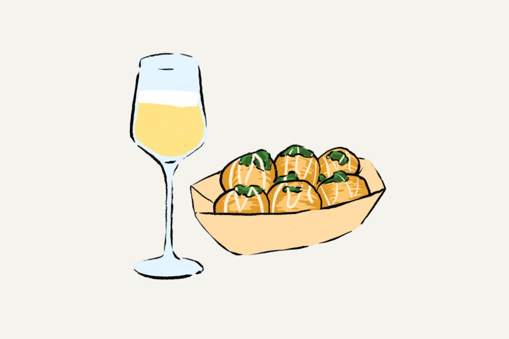 A crispy, ball-shaped Japanese snack that’s often filled with octopus, rich takoyaki calls for something dry, cold and crisp. Kobayashi-Loye suggests pairing a dry, sparkling Riesling with the snack.