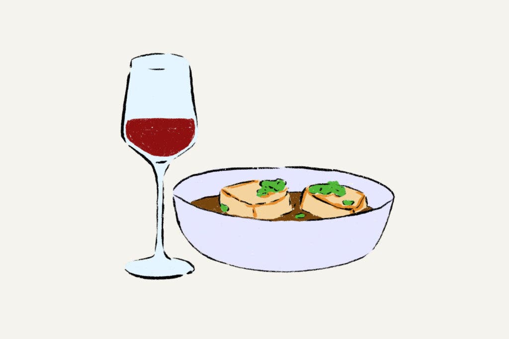 Crispy cubes of tofu in a sweet and savory sauce calls for a wine pairing that won’t overpower it. “There is no need for strong wine for the light flavor of tofu,” says Otsuka. “The food itself is a dish where you can enjoy the taste of the ingredients, like the sweet bean flavor of tofu and the aroma of high-quality bonito stock.”